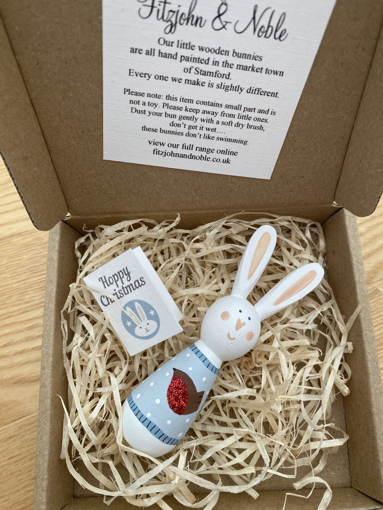 Your bun comes with a teeny Hoppy Christmas mini card for you to write in, packaged with wood shred in a little box. Because every bunny is painted by hand each is slightly different.