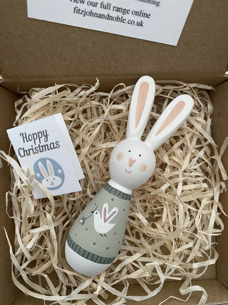 Your bun comes with a teeny Hoppy Christmas mini card for you to write in, packaged with wood shred in a little box. Because every bunny is painted by hand each is slightly different.