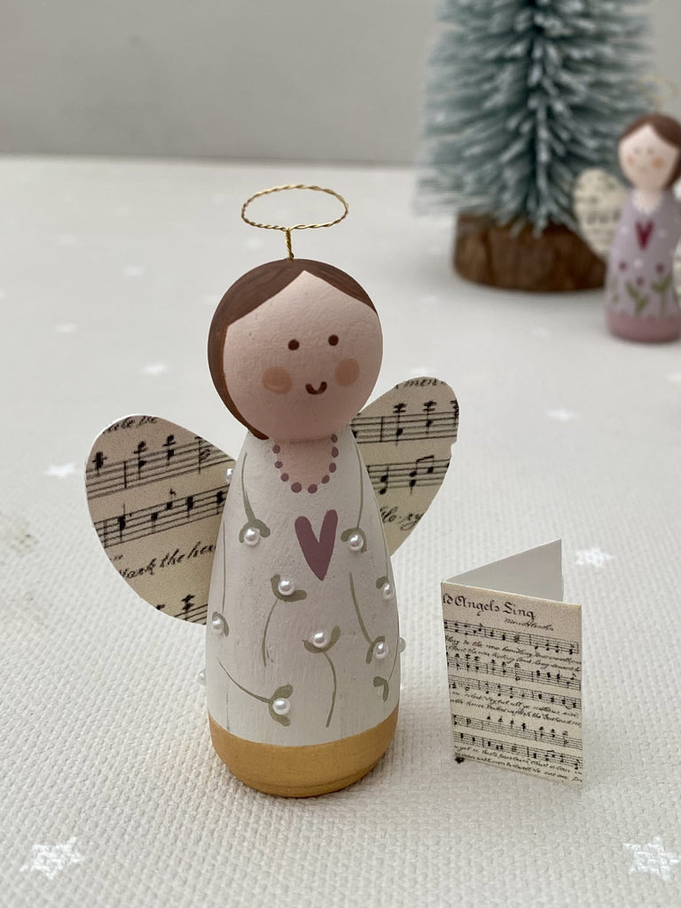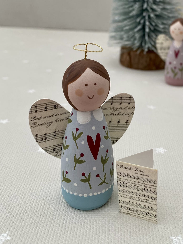 Each angel has a name and is different so please choose your favourite from the list. We paint each one by hand then add a twisted wire halo and paper wings. Each comes with a teeny weeny little song sheet card too! We are currently adding more to the list so please check back for updates over the next few days.